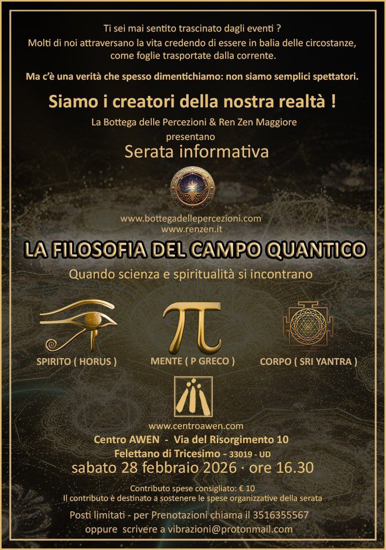Nell’ambito del progetto, Ren Zen Maggiore guiderà un viaggio dentro la Filosofia del campo quantico e dentro il benessere secondo lo Zen, dove meditazioni, mantra e respirazioni consapevoli diventano sentieri di purificazione e lucidità interiore. In questo cammino, la sistemica delle percezioni e delle vibrazioni diventa una chiave per abitare la coscienza in modo più intenso: i cinque sensi, insieme al mentale, si trasformano in ponti sottili che conducono verso gli extrasensi, permettendo di sperimentare la presenza interiore come un campo vivo, sensibile e in continua espansione. A sostenere il percorso c’è la carta dei valori, una mappa che in sistemica aiuta a far emergere i significati più profondi e condivisi delle parole, rivelando ciò che unisce e dà forma alla nostra esperienza. Un modo per evidenziare la soggettività dell’esperienza coscienzale con un lavoro di gruppo.